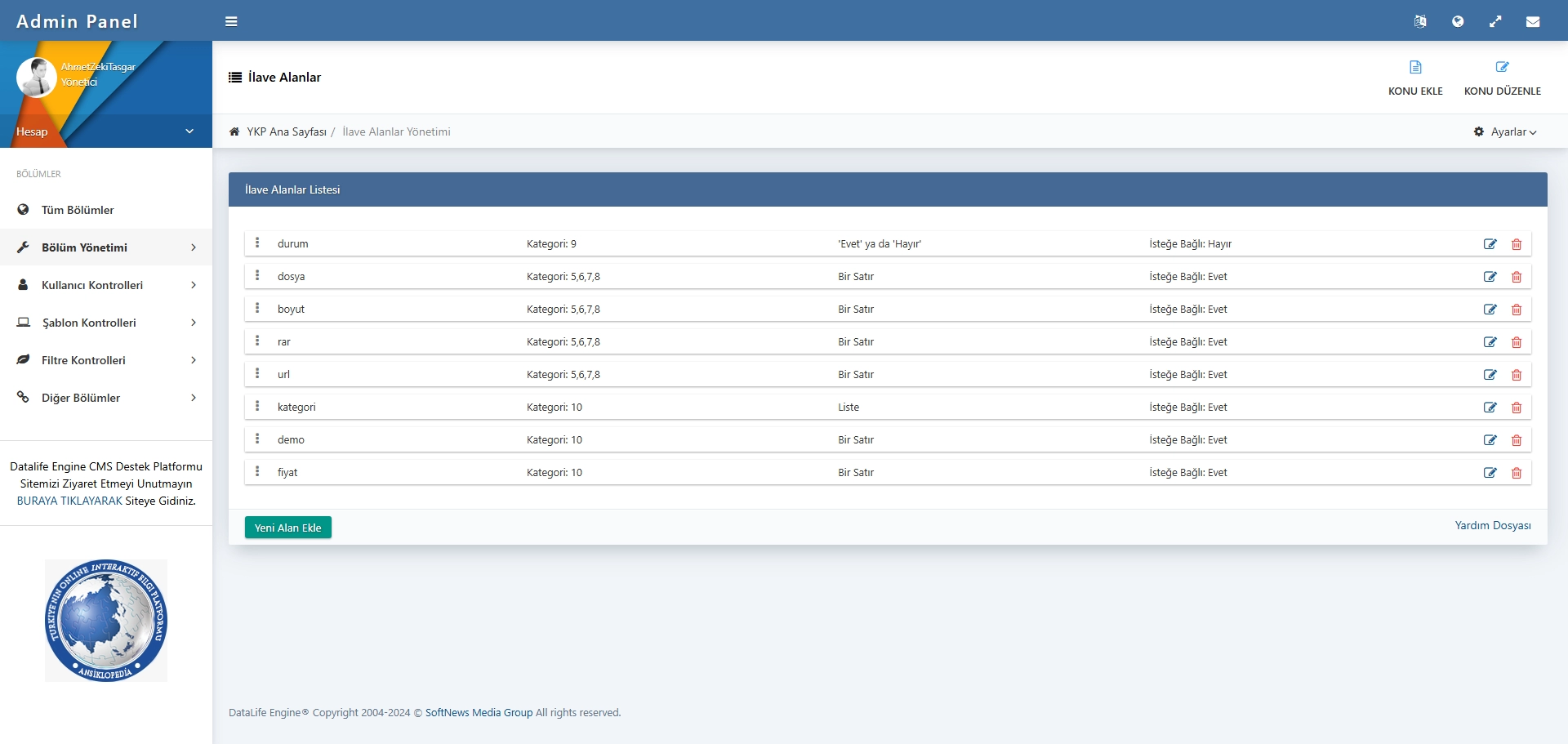 17 ) Bölüm Yönetimi > İlave Alanlar