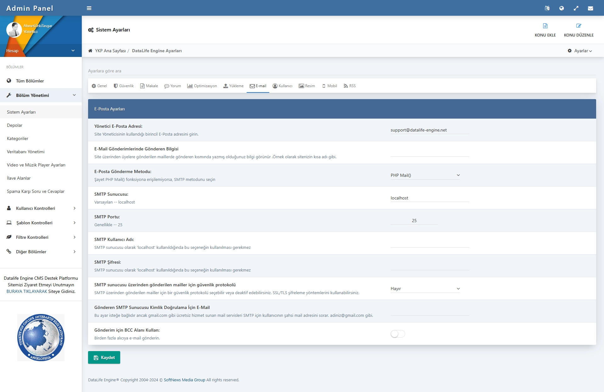 10 ) Bölüm Yönetimi > Sistem Ayarları > E-Mail Ayarları