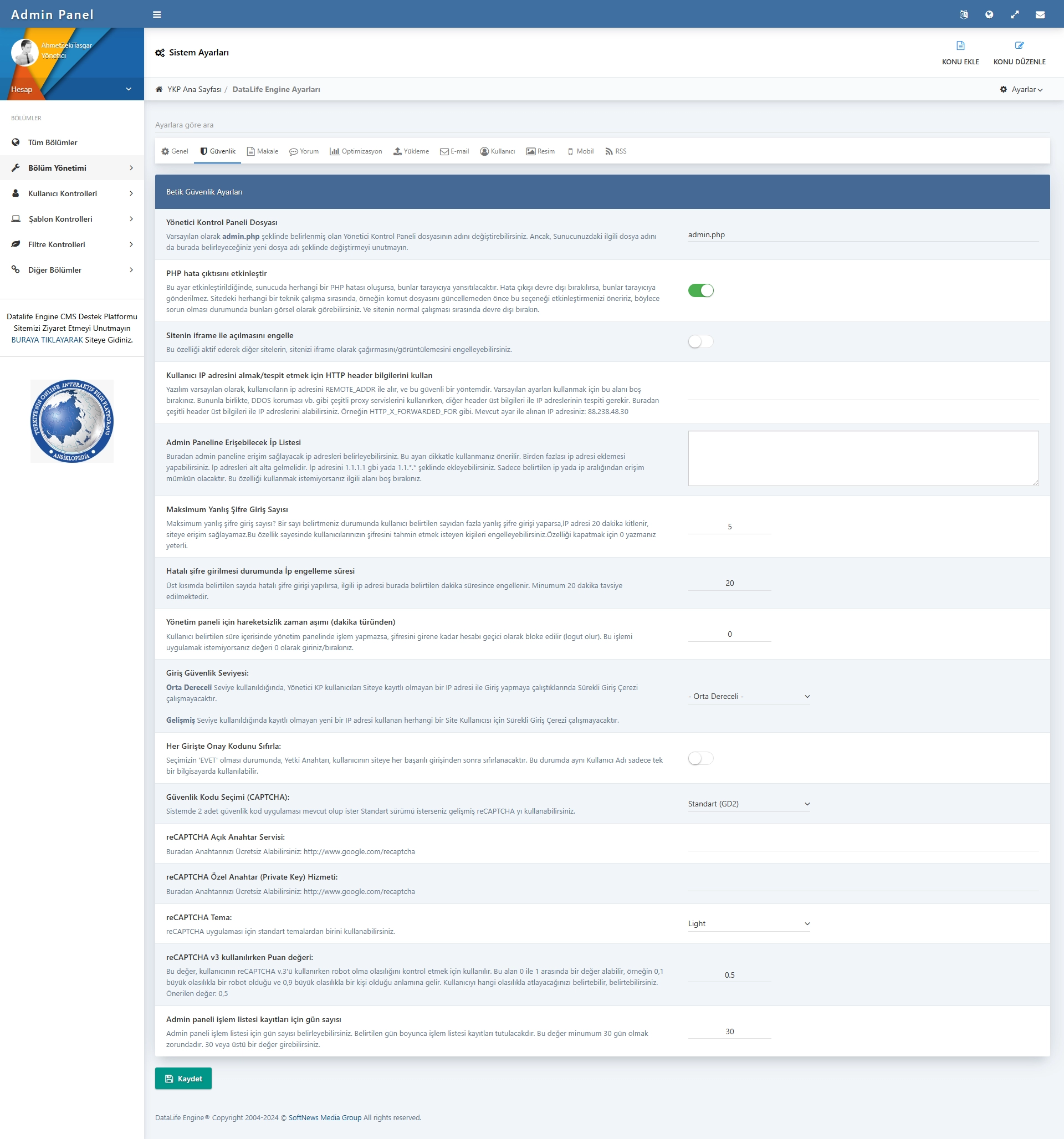 5 ) Bölüm Yönetimi > Sistem Ayarları > Güvenlik Ayarları