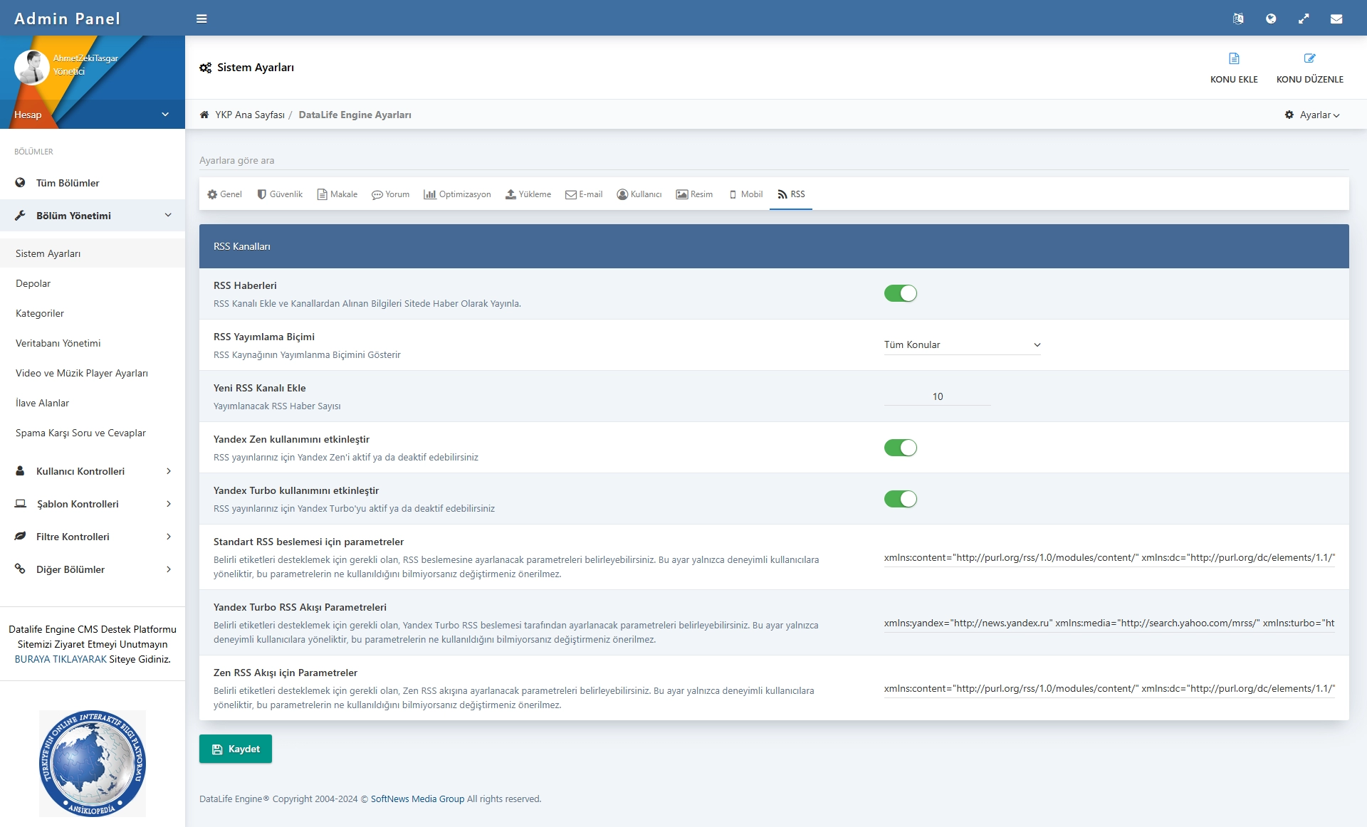 - 14 ) Bölüm Yönetimi > Sistem Ayarları > RSS Ayarları