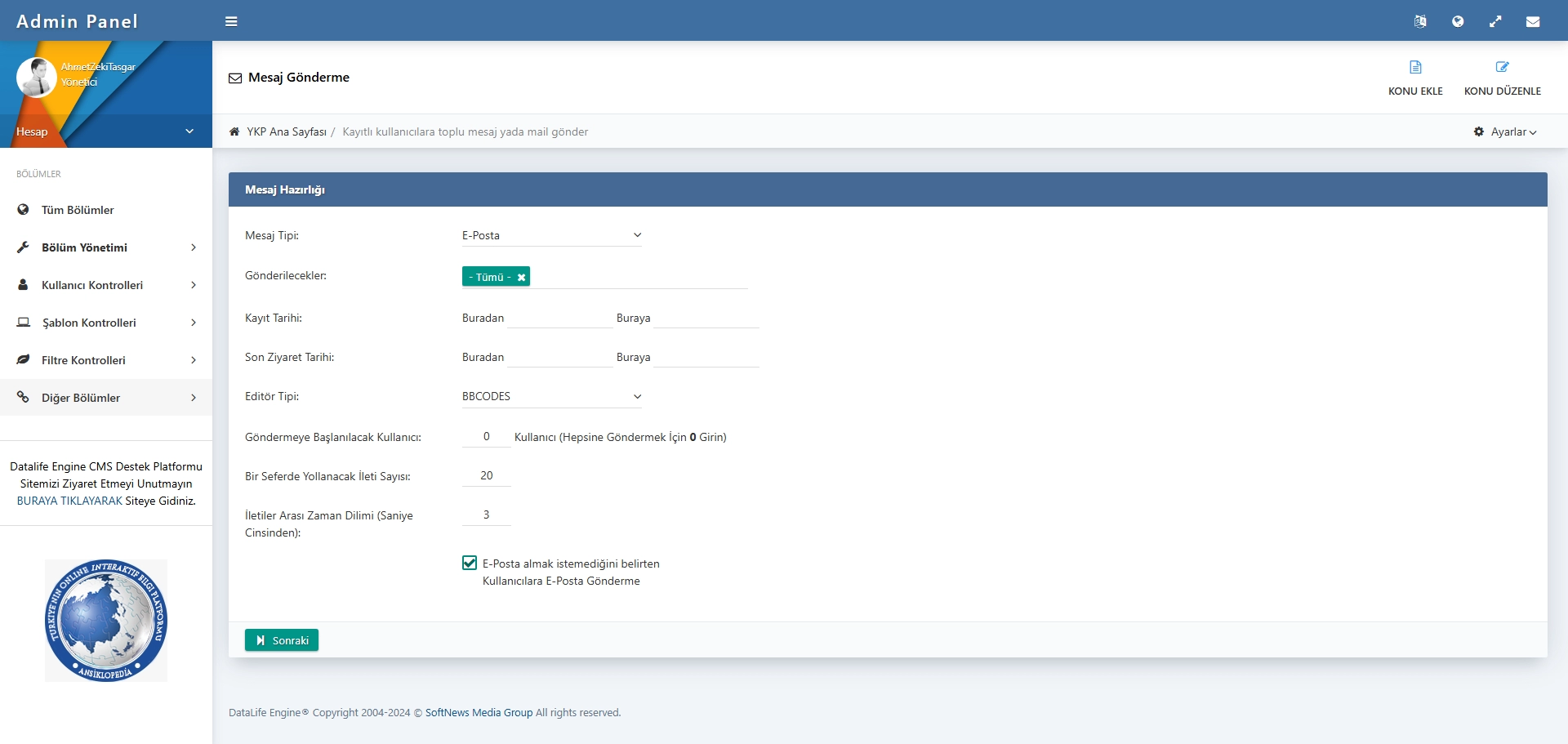 22 ) Diğer Bölümler > Mesaj Gönderme