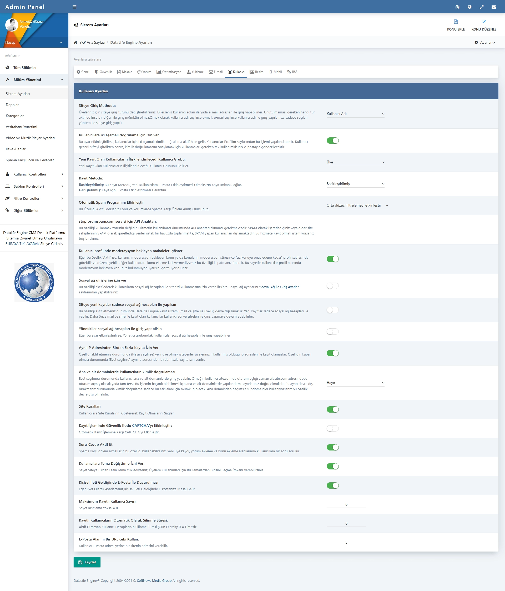 11 ) Bölüm Yönetimi > Sistem Ayarları > Kullanıcı Ayarları