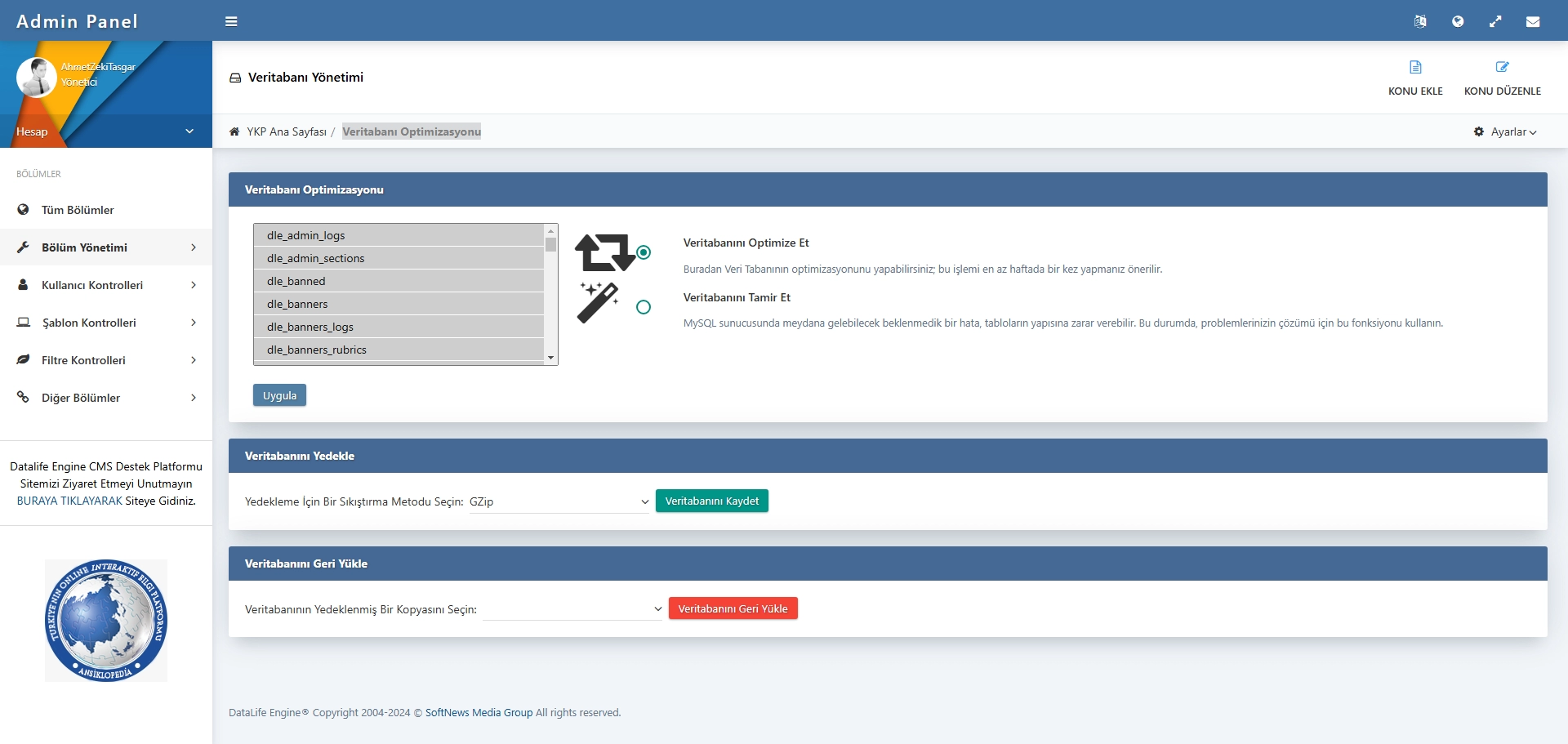 - 16 ) Bölüm Yönetimi > Veritabanı Yönetimi